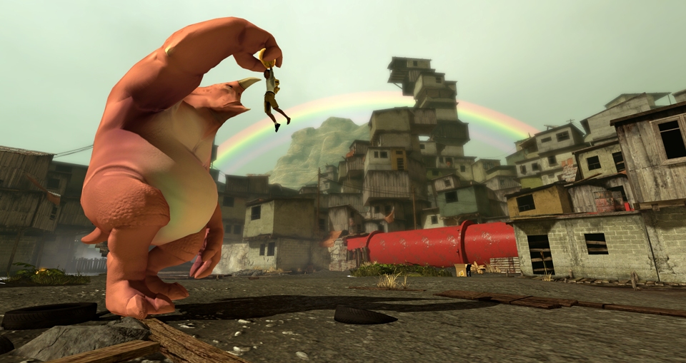 The first encounter with Monster, learning to interact with him and where it ultimately leads ends up as a beautiful synecdoche of the entire game, something that is revealed upon completion and subsequent reflection and replay sessions. Towards the end of this first encounter with the beast, he and Quico come across some frogs that Monster seems more enthusiastically interested in than the fruit. He eventually catches one and devours it, turning into a raging and flaming version of his namesake and throwing Quico about with violence. It’s a stark contrast to the playfulness that precedes it and suddenly we come to understand that Papo & Yo, which translates to ‘Father & I’ in English, isn’t just about a fantastical adventure of escape, but a story about a child dealing with an alcoholic father.
