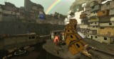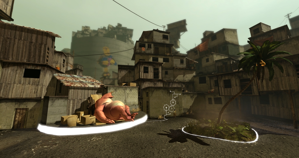 The first screen to greet players upon selecting a new game from the main menu is a dedication from Creative Director, Vander Caballero, to his family on helping him survive his father. Right from the very beginning, Papo & Yo isn’t going to be a normal story about any of the usual tropes. We then see the protagonist, Quico, huddled in a wardrobe as light spills through its shuttered doors and the silhouette of a monster stomps past. Quico then turns to the rear of the wardrobe where there are chalk marks on the wall, and he falls through into the game-world which is a charming abstract of Brazilian urban spaces. Throughout the game, Quico and NPCs speak in what I initially thought was Portuguese, but have since learned is a semi-made-up language with translated English speech-bubbles, adding to the authenticity and admittedly wonderful indie feel. Each area is constructed mostly of squat, square shacks known in Brazil as favela (http://en.wikipedia.org/wiki/Favela) with a wonderful sense of place as you guide Quico running about amongst them.