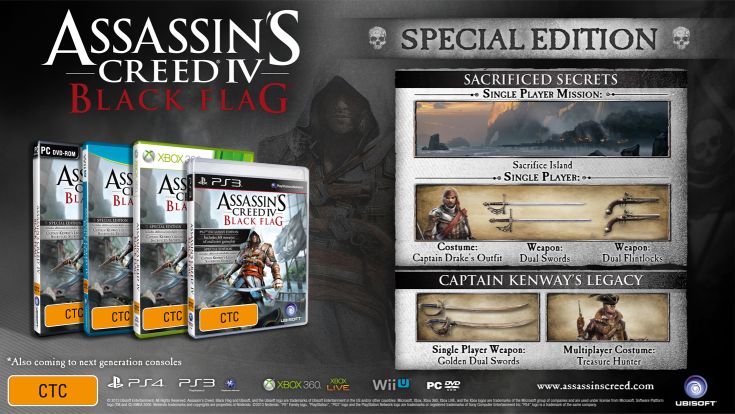As always with the Assassin’s Creed games this new instalment in the series has a number of special editions available for pre-order: the Black Chest Edition, the Buccaneer Edition, the Skull Edition, and the Special Edition (original I know). For details on what each includes check out these images: