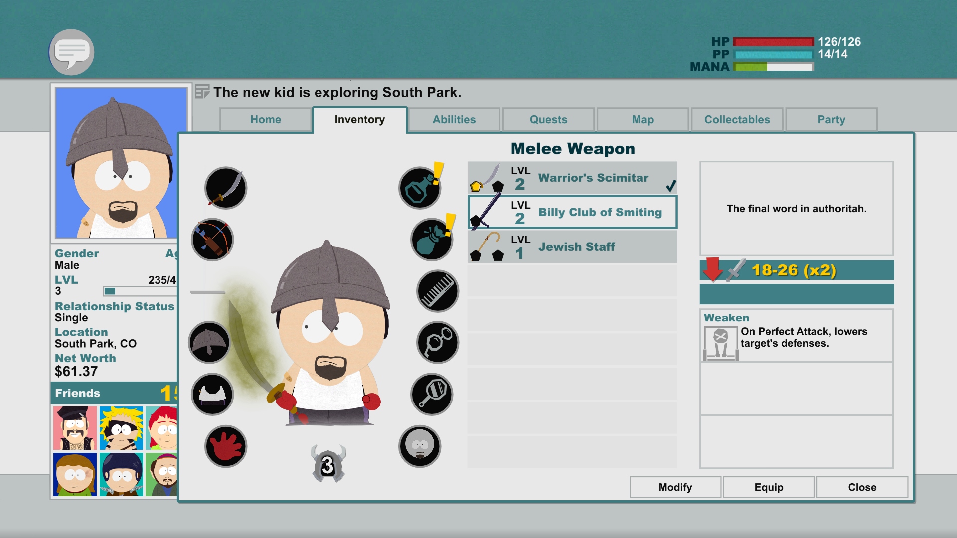 RPGs can often be daunting to get into, with the majority of them usually taking upwards of 30 hours which can be quite a commitment. Obsidian have done an excellent job to have the mouldings of an epic RPG while making the game easy to pick up for RPG newcomers. The Stick of Truth could be categorised as a turn-based RPG, although it is more like a turn-based RPG-lite. All the makings of an in-depth RPG are present: levelling up, a huge amount of weapons and equipment, upgradable perks, magic and special moves, and yet you never feel like you have to grind to level up, or worry too much about the gear you are wearing. This gives the player the option of how deep they will take the simple-to-use levelling system. At the beginning of the game the player has the option to play as 4 different classes, a warrior, a mage, a thief and a jew. I chose to go with the thief type but this ultimately amounts to nothing as you can wear or use any equipment or weapons when playing through the game and only the special attacks differ between the classes.
