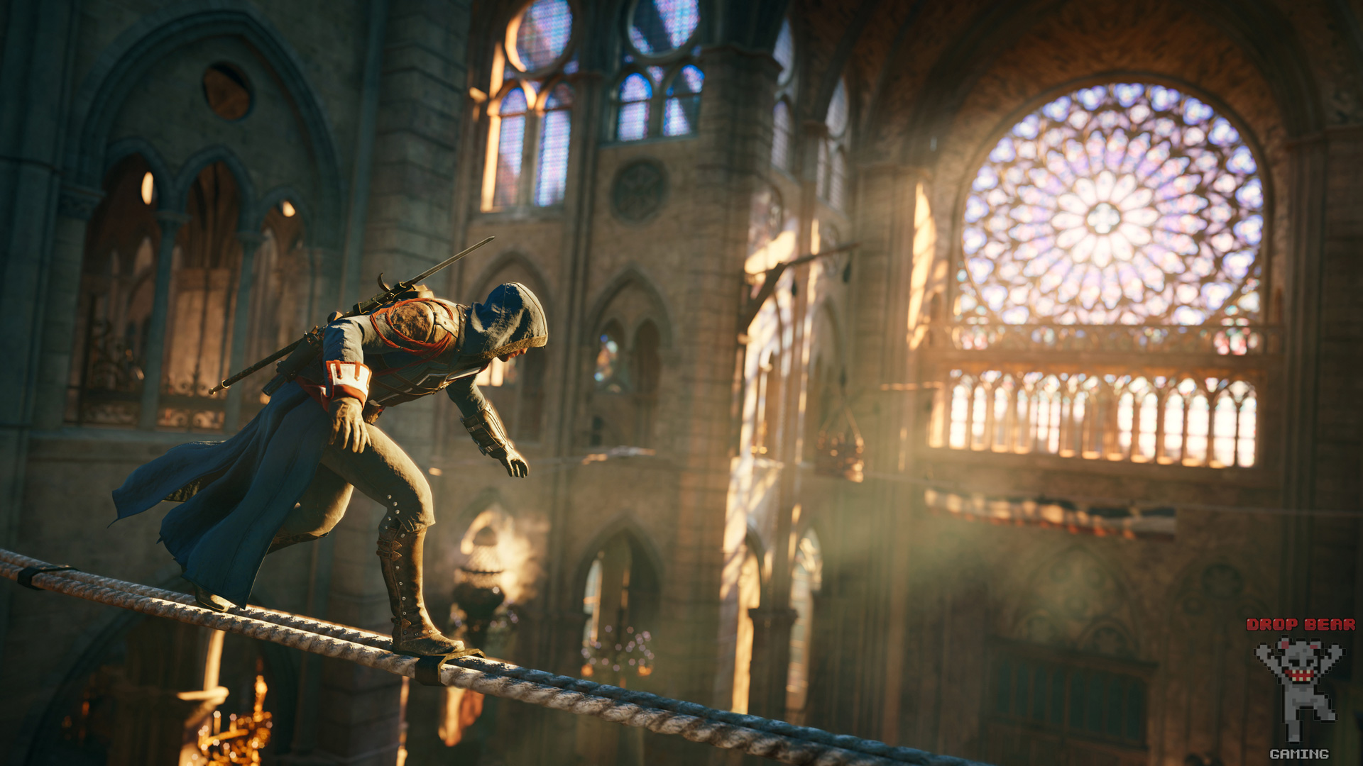 Despite the huge focus on traversal in the Assassin’s Creed series, Ubisoft have never really gotten it perfect and the ongoing issues that the series has faced plague Unity as well. Arno often got stuck running up a wall when I was telling him to go through a window. There were even times where Arno would just get stuck on a bench that was only a foot off the ground or a fence post that he just couldn’t seem to leap off. A nice addition to the game is the ability to quickly and easily traverse down a building with the new parkour down mode of traversal. This makes scaling the buildings of Paris a lot more technical, having to make the decision of going up, down or through the building. There were some odd occasions while leaping across the rooftops of Paris where Arno felt like a magnet that floated and was drawn to where he was leaping, although more often than not, this new system, with the help of some slick new animations, looked great and made Arno feel like a master of his craft.