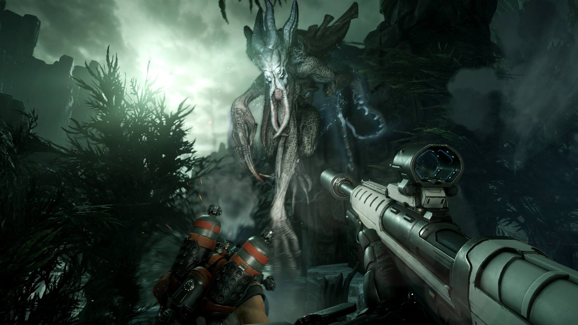 There are 3 different playable monsters in Evolve: the grounded brute Goliath who relies on ground pounds, hurling huge rocks, and breathing fire, the Kraken who takes the more aerial route with ranged attacks, homing mines, and electrical storms, and the Wraith who is easily the most devious and powerful of the three. The Wraith has the ability to create copies of itself to give it time to slink away and hide, it can also rip a hunter away from the protection of their group. The most powerful attack that the Wraith has in its arsenal is the ability to create a Supernova which increases it’s speed and damage immensely within a small area. All of the classes and monsters are great to go through so try them all out and see which one fits your play-style, yet keep in mind that at the beginning of the game you start with only one monster and one character from each class. Players will have to slog it out and upgrade each of their respective abilities in order to unlock a new character or monster. Depending on how often you play the game or how proficient you are with each ability, the process of unlocking all that the game has to offer can be a long and often tiresome ordeal. When everything is finally unlocked though, Evolve opens up into a game that is rich with plenty of options.